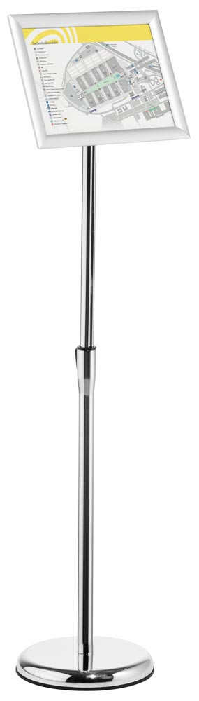 ∙ Schnell aufgebauter Infoständer mit robustem DIN A4/A3 Aluminium-Klapprahmen, silber eloxiert ∙ Runder Standfuß mit Gummiring verhindert Kratzer auf dem Boden ∙ Höhenverstellbar durch Teleskopstange (von 770/860 mm stufenweise verstellbar bis zu einer Höhe von max. 1205/1290 mm im Hochformat) ∙ Klapprahmen ist einfach drehbar vom Hoch- ins Querformat ∙ Lesewinkel durch Kugelgelenk verstellbar ∙ Reflexionsarme, UV-beständige Schutzfolie ∙ Schlagfeste Rückwand aus Polystyrol ∙ Ecken auf Gehrung geschnitten ∙ Ideal für die Gastronomie, den Einzelhandel, Museen, Ausstellungen, Messehallen, Empfangs- und Wartebereiche, Konferenzräume etc.