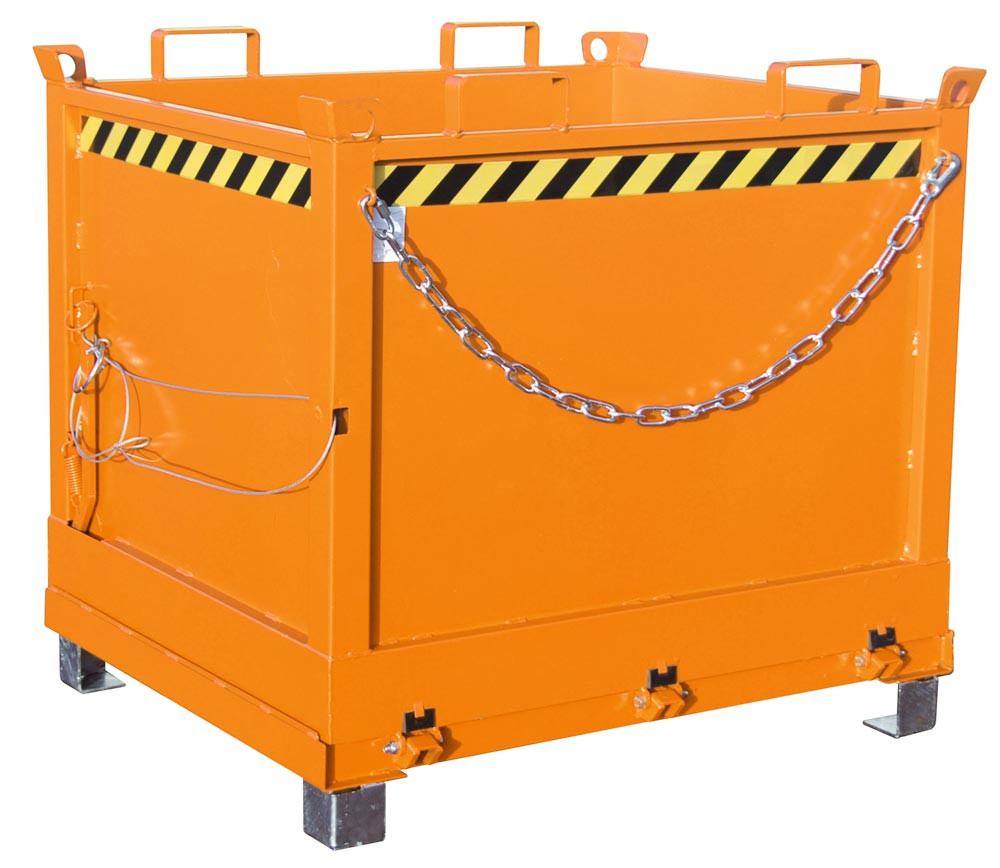 ∙ Entriegelung der Bodenklappe per Seilzug vom Stapler aus ∙ Bodenklappe schließt beim Aufsetzen selbsttätig, 90° Öffnungsbereich ∙ Sicherung für Bodenklappe gegen Abrutschen und ungewünschtes Öffnen ∙ Aufnahme für Gabelstapler und Kran sowie mit Gabelhubwagen transportierbar ∙ Robuste Stahlblechkonstruktion: Wandstärke 3 mm, Bodenklappenstärke 4 mm ∙ Einfahrbügel an der Oberseite des Behälters, Einfahrtaschen an der Unterseite · Unterfahrhöhe 100 mm