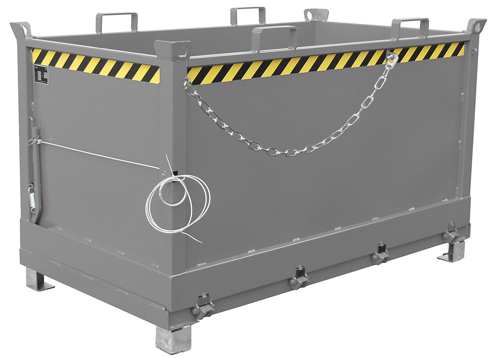 ∙ Entriegelung der Bodenklappe per Seilzug vom Stapler aus ∙ Bodenklappe schließt beim Aufsetzen selbsttätig, 90° Öffnungsbereich ∙ Sicherung für Bodenklappe gegen Abrutschen und ungewünschtes Öffnen ∙ Aufnahme für Gabelstapler und Kran sowie mit Gabelhubwagen transportierbar ∙ Robuste Stahlblechkonstruktion: Wandstärke 3 mm, Bodenklappenstärke 4 mm ∙ Einfahrbügel an der Oberseite des Behälters, Einfahrtaschen an der Unterseite · Unterfahrhöhe 100 mm