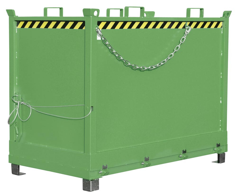 ∙ Entriegelung der Bodenklappe per Seilzug vom Stapler aus ∙ Bodenklappe schließt beim Aufsetzen selbsttätig, 90° Öffnungsbereich ∙ Sicherung für Bodenklappe gegen Abrutschen und ungewünschtes Öffnen ∙ Aufnahme für Gabelstapler und Kran sowie mit Gabelhubwagen transportierbar ∙ Robuste Stahlblechkonstruktion: Wandstärke 3 mm, Bodenklappenstärke 4 mm ∙ Einfahrbügel an der Oberseite des Behälters, Einfahrtaschen an der Unterseite · Unterfahrhöhe 100 mm
