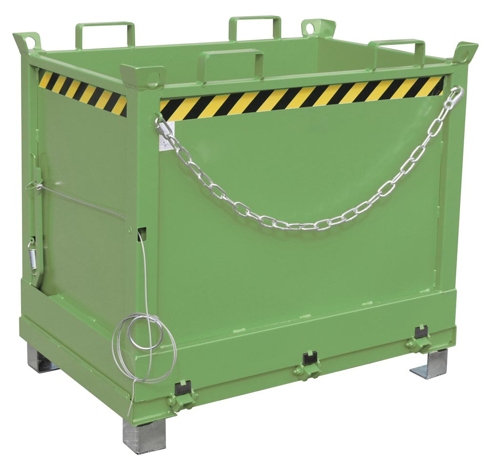 ∙ Entriegelung der Bodenklappe per Seilzug vom Stapler aus ∙ Bodenklappe schließt beim Aufsetzen selbsttätig, 90° Öffnungsbereich ∙ Sicherung für Bodenklappe gegen Abrutschen und ungewünschtes Öffnen ∙ Aufnahme für Gabelstapler und Kran sowie mit Gabelhubwagen transportierbar ∙ Robuste Stahlblechkonstruktion: Wandstärke 3 mm, Bodenklappenstärke 4 mm ∙ Einfahrbügel an der Oberseite des Behälters, Einfahrtaschen an der Unterseite · Unterfahrhöhe 100 mm