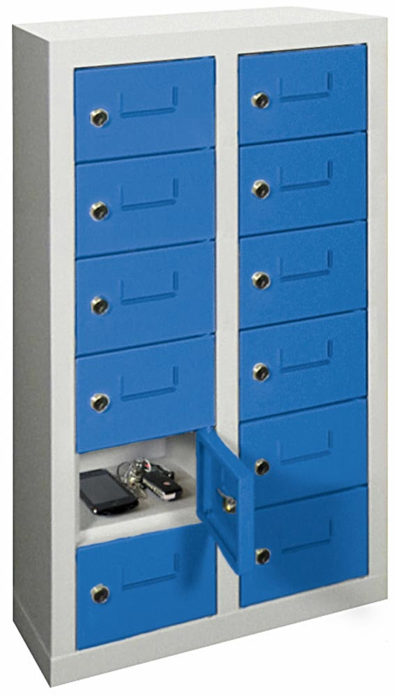 Kleinfachschrank, Wandbefestigung, BxTxH 460x200x815 mm, 2x6 Fächer, Fachbreite 145 mm, Schloss, RAL 7035/5010 lichtgrau/enzianblau