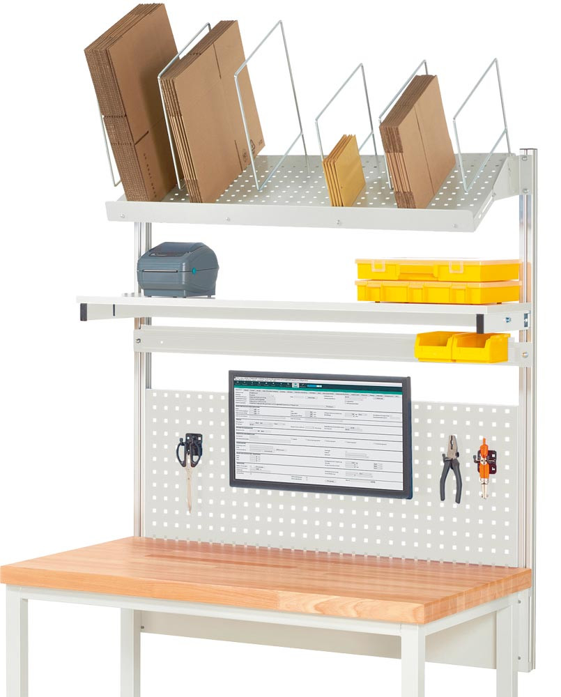 Komplettaufbau für Werkbank B 1500 mm mit Etagenbord, Lochplatte H 450 mm, Montageadapter, Kartonagemagazin,Halteschiene, RAL 7035 E6490838