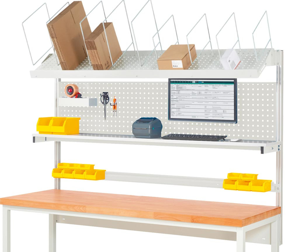 Komplettaufbau für Werkbank B 1500 mm mit Etagenbord, Lochplatte H 450 mm, Montageadapter, Kartonagemagazin,Halteschiene, RAL 7035 E6490838