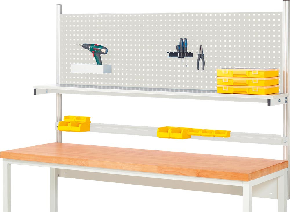 Komplettaufbau für Werkbank B 750 mm mit Etagenbord, Lochplatte H 650 mm, Halteschiene, RAL 7035 E6490821