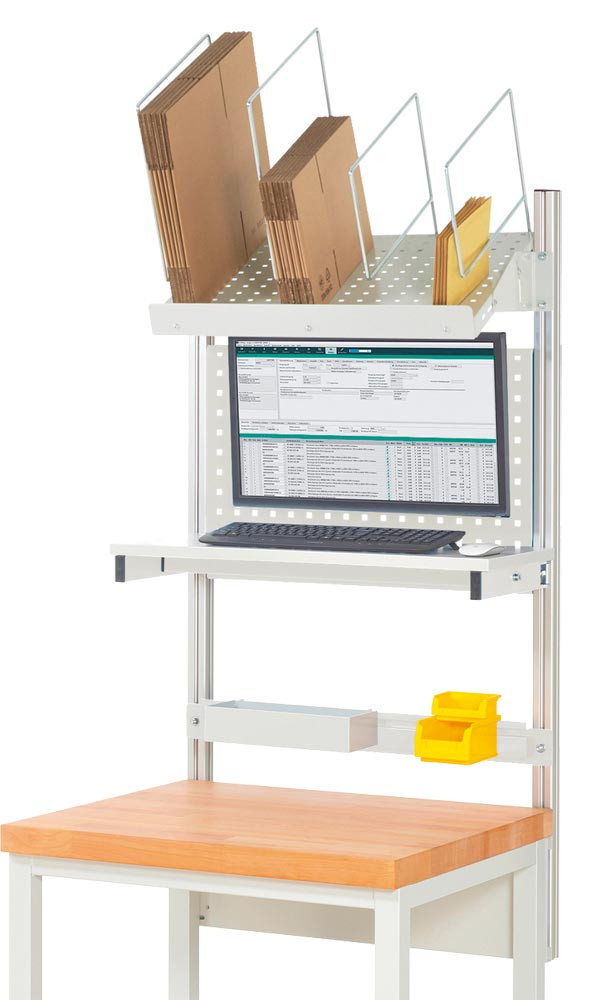 Komplettaufbau für Werkbank B 750 mm mit Etagenbord, Lochplatte H 450 mm, Montageadapter, Kartonagemagazin,Halteschiene, RAL 7035 E6490835