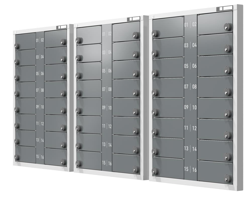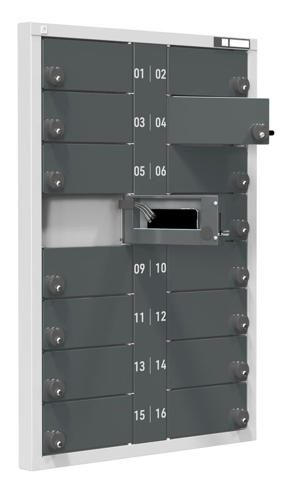 Ladeboxen für Handys, 16 Fächer, 3 Anschlüsse, BxTxH 830x57x1155 mm, 35 kg, Korpus RAL 7035, Türen RAL 5012 E6488612