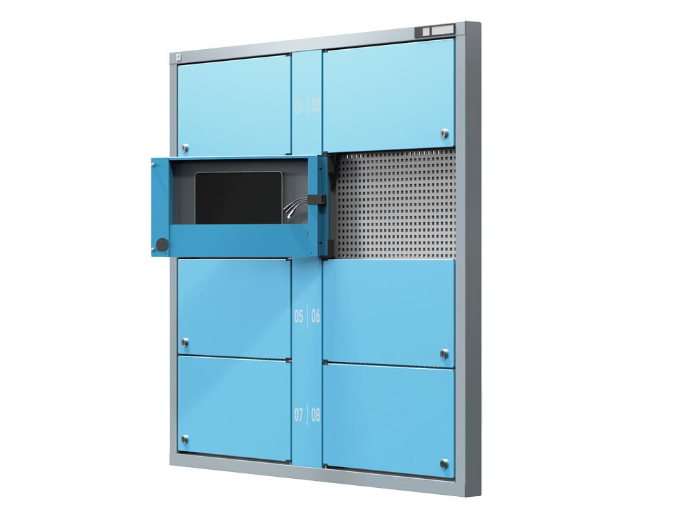 Ladeboxen für Tablets, 8 Fächer, 3 Anschlüsse, BxTxH 1182x57x1155 mm, 55 kg, Korpus RAL 7035, Türen RAL 5012 E6488613