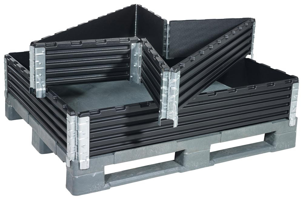 ∙ Aufsatzrahmen für Euro- und Industriepaletten ∙ Aus ABS mit verzinkten Scharnieren ∙ Diagonal klappbar ∙ Rahmenstärke 20 mm ∙ Bei Nichtgebrauch platzsparend zusammenfaltbar ∙ Farbe schwarz ∙ VE 2 Stück