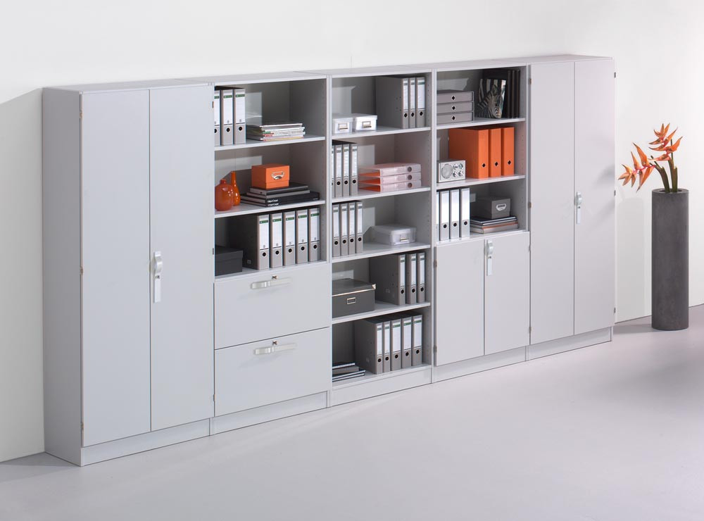 ∙ Beidseitig melaminharzbeschichtete Oberflächen, blend- und reflexfrei, abriebfest und pflegeleicht ∙ Von oben verstellbare Sockelfüße zum Ausgleich von Bodenunebenheiten