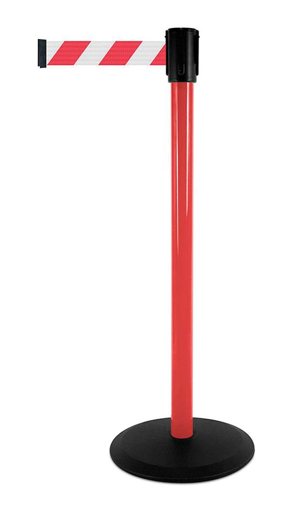 Rollgurtpfosten, Modell Safety, Pfosten rot, 3,65 m Gurtband rot/weiß, 4-Wege System, Gurtbremse, Sicherungsclip