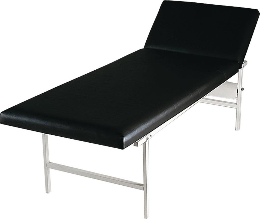Rahmenkonstruktion aus Stahlrohr-Vierkantprofilen, stabil und belastbar, integrierte Abrollvorrichtung für Ärztekrepp · Bezug aus gewebeverstärktem Kunstleder, strapazierfähig, pflegeleicht, schmutzabweisend · schwarz · Polster aus Qualitäts-Schaumstoff · Kopfteil mehrstufig verstellbar · Arbeitsstätten-Regel ASR A4.2