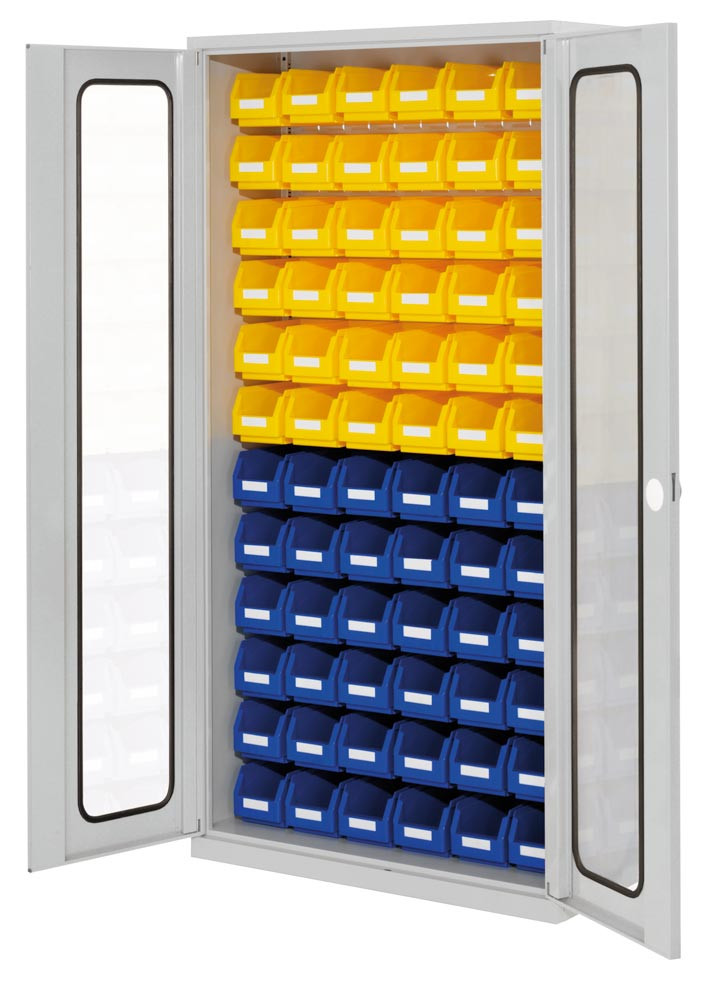 ∙ Systemschränke mit Schlitzprägung in der Rückwand, bestückt mit Sichtlagerkästen ∙ Ohne Fachböden, die Sichtlagerkästen werden an der Schlitzprägung aufgehangen ∙ Stabile, kunststoffbeschichtete Stahlblechkonstruktion in RAL 7035 lichtgrau ∙ Türen vorgebaut, entweder mit Sichtfenster oder geschlossen, Öffnungswinkel über 200° ∙ Dreiriegeliges Sicherheits-Zylinderschloss mit versenktem Drehgriff · Die Bestückung mit Sichtlagerkästen erfolgt je Größe und farblich sortiert · Sichtlagerkästen GS-geprüft