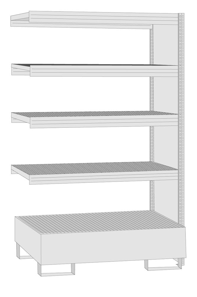 Umweltregal, Anbaufeld, offener Rahmen, mit 4 Gitterrost-Fachebenen und Auffangwanne Auffangvolumen 210 l, BxTxH 1285x600x2500 mm E812706