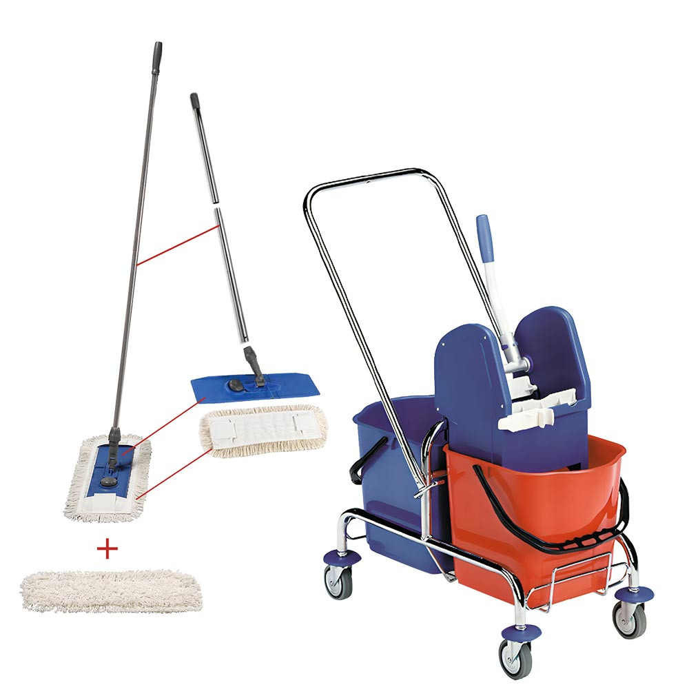 · Hochwertiger Einfachfahreimer inkl. Eimer · Profimopppresse inkl. 2-teiliger Chromstiel, Klapphalter für Moppbezüge mit Taschen in einer Breite von 500 mm · 5 Baumwoll-Moppbezüge in passender Breite · Farbe blau/rot