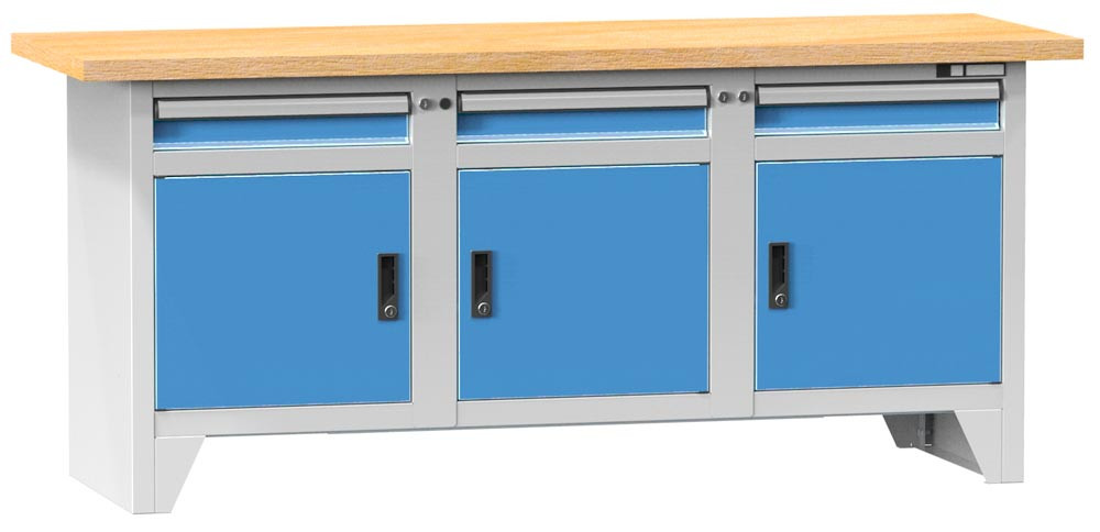 Werkbank, BxTxH 2000x700x880mm, 3 Module, 3 Schubladen 3x100 mm , 3 Türen, 3 Böden, Traglast 800 kg, RAL 7035/5012 E6423912