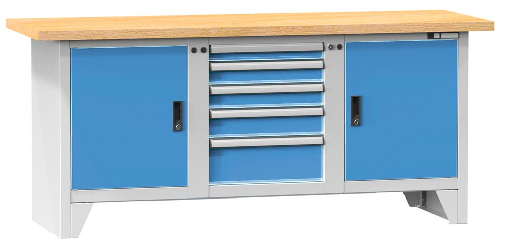 Werkbank, BxTxH 2000x700x880mm, 3 Module, 5 Schubladen 75, 2x100,125,200 mm , 2 Türen, 2 Böden, Traglast 800 kg, RAL 7035/5012 E6423911