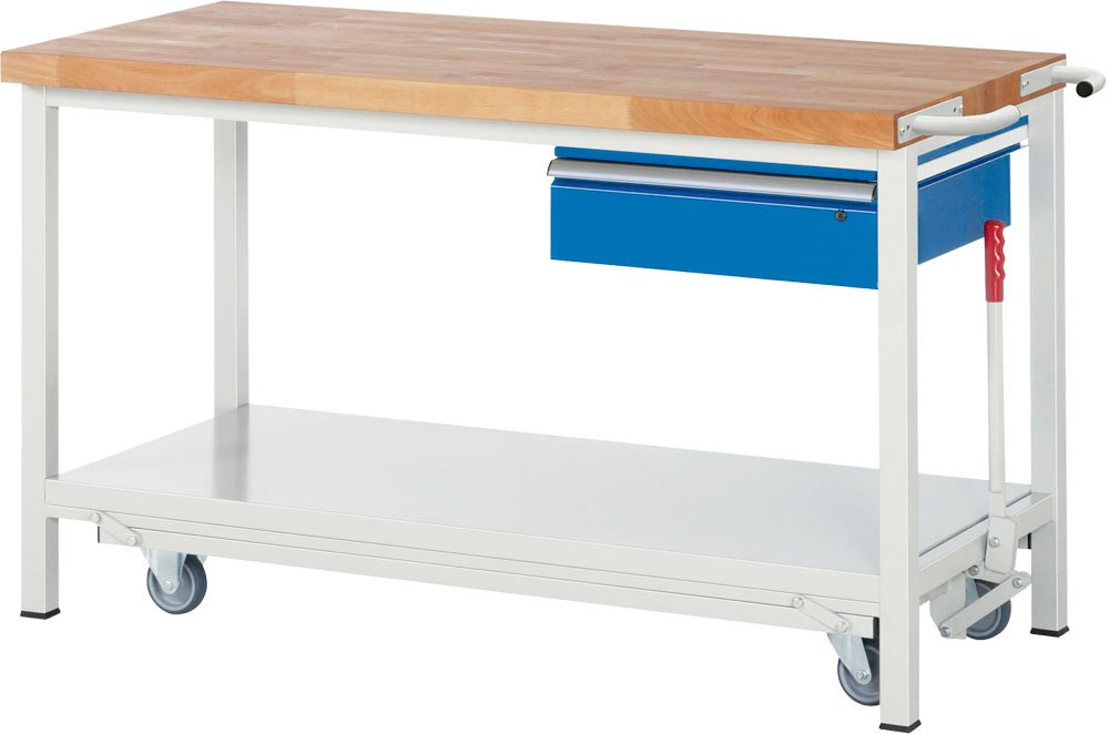 Werkbank mit absenkbarem Fahrgestell, BxTxH 750x700x880 mm, 1 Hängeschublade 150 mm, Platte Buche 40 mm, Ablageboden, RAL 7035/5010 E1893527